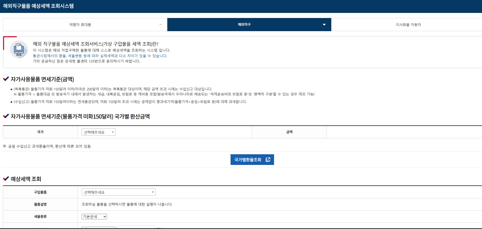 관세청 제공 관부가세 예상세액 조회 시스템